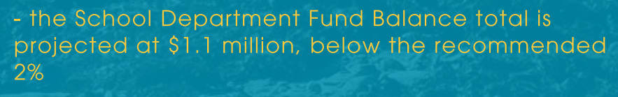 Add to this the above statement. The projected balance of $1.1 million is significantly below the $2.7 million where it was at the beginning of this fiscal year. The only way that balance could go down is if the district used it. And if so, are they projecting a $1.6 million spending deficit this year? What unexpected one time costs happened this year? And should we pretend the $17 million fund balance in the town doesn’t exist?